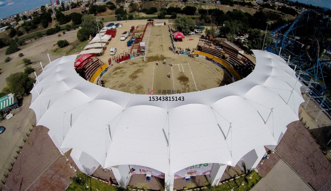 膜材選擇與性能要求:膜結構體育館看臺公司的首要任務是選用合適的膜材。優(yōu)質的膜材應具備輕質、高強度、防火、防水、防曬、耐用等特點,以確??磁_的結構安全和使用壽命。同時,還需考慮膜材的透光性、隔熱性能和環(huán)保性能,以提供舒適的觀賽體驗和滿足環(huán)保要求。
