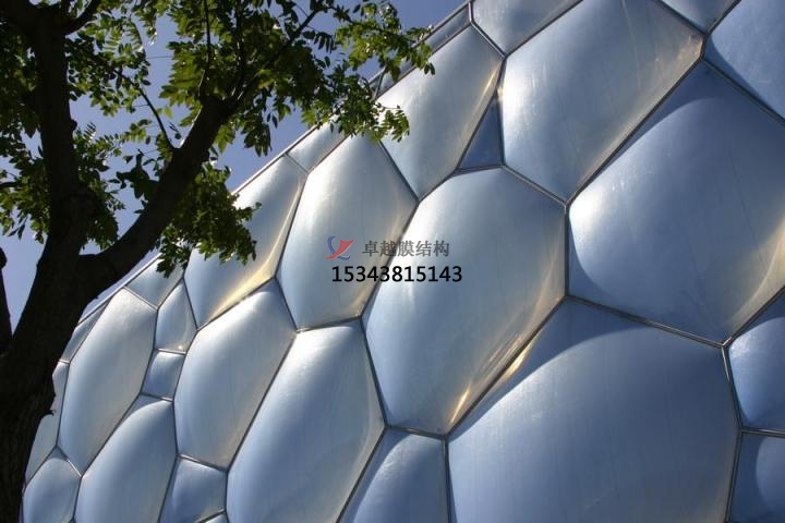 3.玉樹ETFE膜結構防火性能好;膜結構使用的玉樹ETFE膜結構達到B1、DIN4102防火等級標準,燃燒時也不會滴落。且該膜質量很輕,每平方米只有0.15-0.35公斤。這種特點使其即使在由于煙、火引起的膜融化情況下也具有相當?shù)膬?yōu)勢。