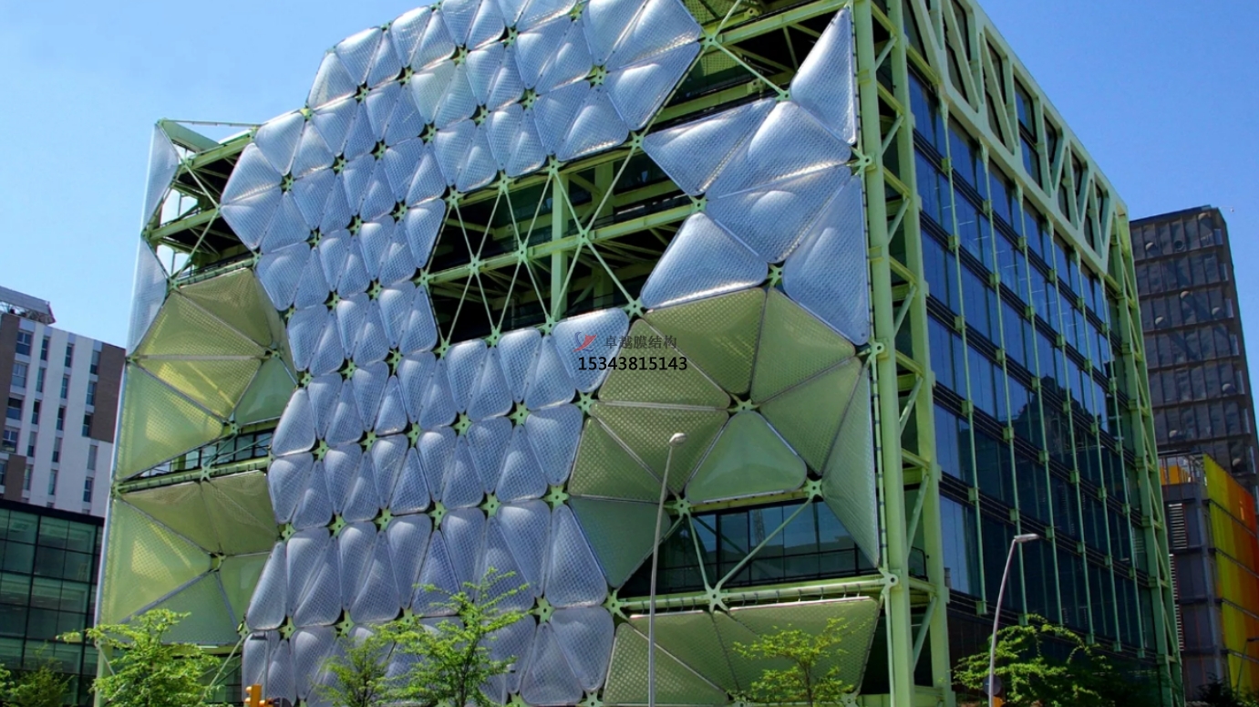 它們都需要采用專門的鋁合金支架進(jìn)行支撐固定,并且根據(jù)一定規(guī)律分割成膜單元。單層ETFE膜外觀造型比較簡單,看起來和玻璃相近;雙(多)層氣枕膜需要使用專業(yè)的充氣系統(tǒng)進(jìn)行智能充氣,保持膜氣枕鼓起,從而獲得立體的氣泡美感和良好的保溫隔熱性能。