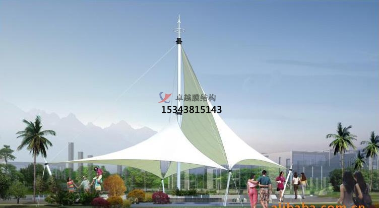 2.標志性小品 一個城市的中心區(qū)反映一個城市的地輿面貌和民族風情,一起,也是一個城市文化開展程度的標志。而景象設計要求其具有廣泛的可讀性、老少皆宜,既有超凡脫俗的藝術(shù)價值,又能使群眾膾炙人口與群眾息息相通。膜結(jié)構(gòu)以其鮮明的特性和標識性,使用于城市小品設計中。