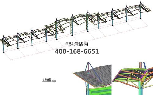 本工程膜材采用白色高端國產(chǎn)膜材PVDF高自潔環(huán)保建筑膜材,鋼結(jié)構(gòu)采用更好的標(biāo)準(zhǔn)Q235B鋼材,表面采用酚醛底漆處理,面漆采用白色鋼結(jié)構(gòu)專用快干磁漆。