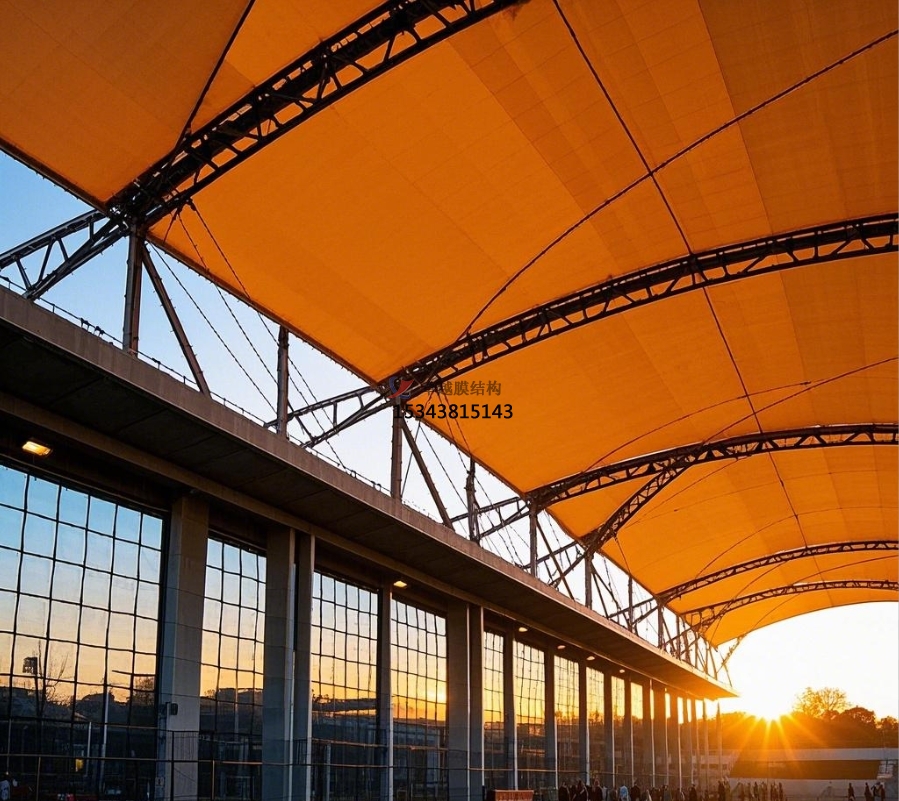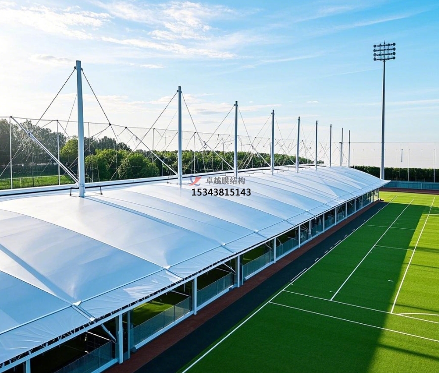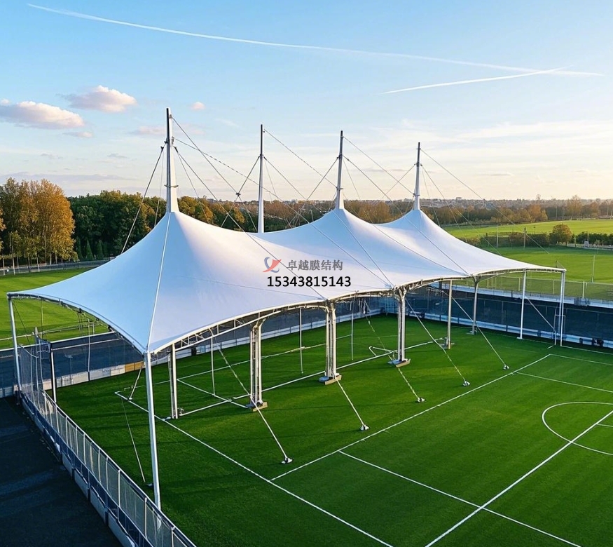足球場膜結構主要由膜材與支撐結構攜手構建。膜材堪稱核心角色,常用的如聚四氟乙烯(PTFE)膜材,不僅具備超強的耐候性,可從容應對風吹日曬、雨雪侵襲,長期使用也不易老化損壞;其自潔性能更是出色,表面不易沾染灰塵污垢,能始終保持潔凈外觀。乙烯 - 四氟乙烯共聚物(ETFE)膜材同樣表現不凡,擁有良好的透光性,可讓充足的自然光灑入足球場,營造明亮舒適的運動環(huán)境,同時具備較高的強度與柔韌性 。