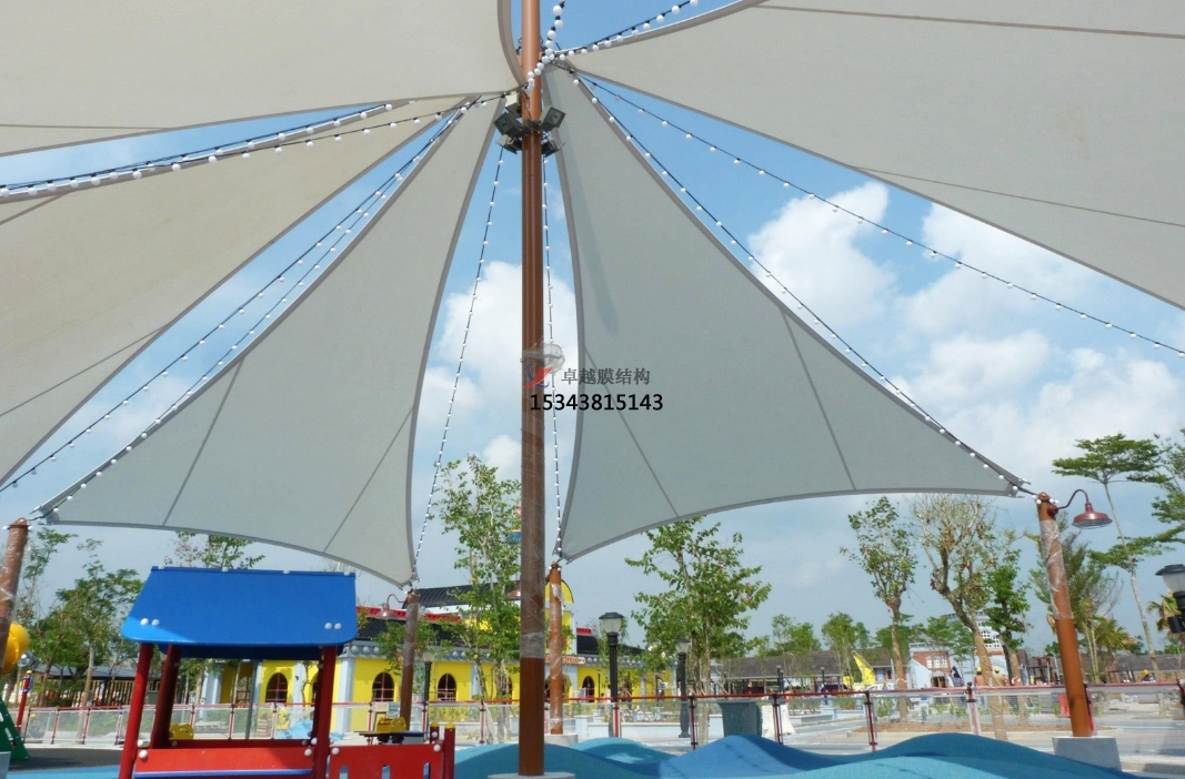 3、多功能性:除了遮陽功能外,膜結(jié)構(gòu)遮陽棚還可以作為陽雨棚、涼亭、連廊等使用。其構(gòu)思獨(dú)特、因地制宜的設(shè)計(jì),使得遮陽棚在賦予景觀小品藝術(shù)化的同時(shí),也將功能實(shí)用性融入其中,提升了游樂場的整體品質(zhì)。