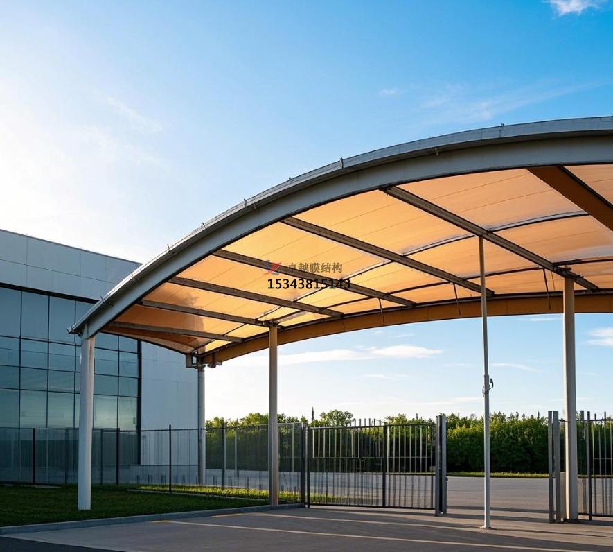 小區(qū)大門膜結(jié)構(gòu)選用的膜材具有出色的物理性能。首先,其防水性能極佳,能有效抵御各種惡劣天氣下的雨水侵襲,為進(jìn)出小區(qū)的居民遮風(fēng)擋雨,確保居民在雨天也能干爽通行。其次,膜材的抗紫外線能力很強(qiáng),能有效阻擋陽(yáng)光中的有害紫外線,延緩膜材老化,保證大門長(zhǎng)期使用后依然能保持良好的外觀和性能。這不僅延長(zhǎng)了膜結(jié)構(gòu)大門的使用壽命,降低了維護(hù)成本,還為居民提供了一個(gè)防曬的過(guò)渡空間,減少了陽(yáng)光直射對(duì)人體的傷害。