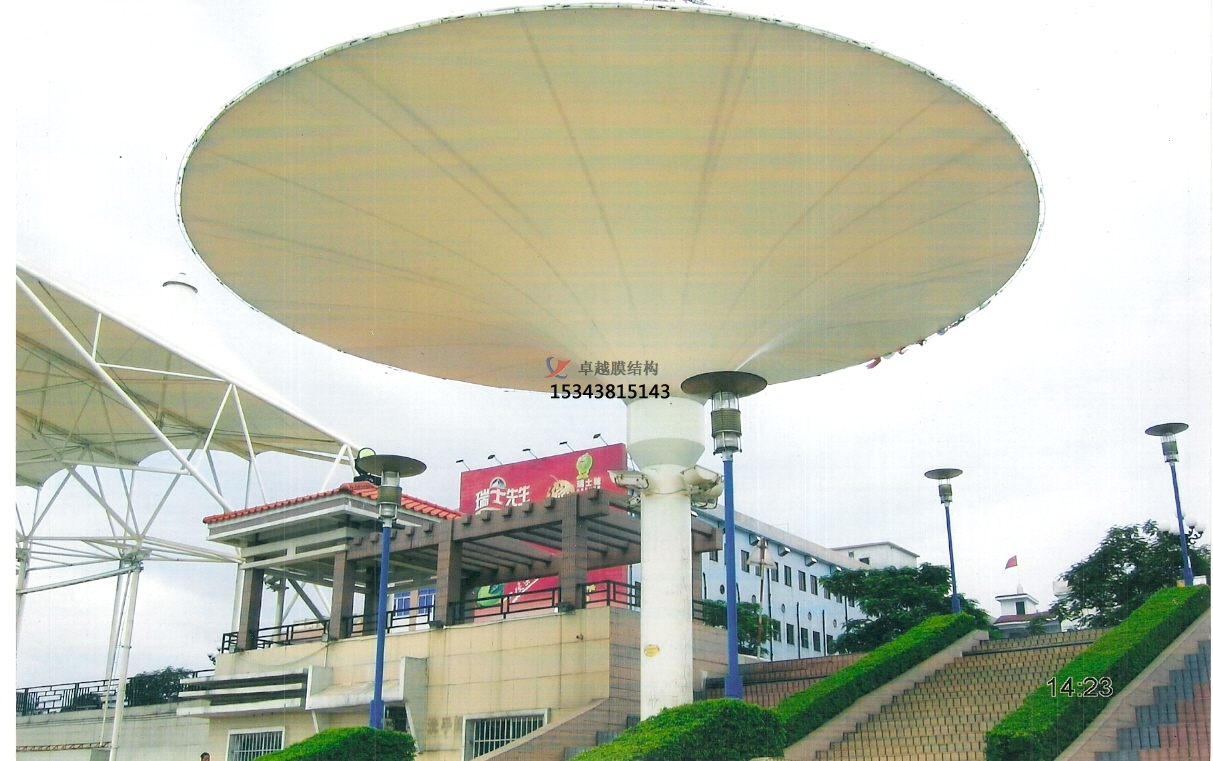 膜結(jié)構(gòu)遮陽雨棚打破傳統(tǒng)純直線建筑風(fēng)格的模式,以其獨(dú)有的優(yōu)美曲面造型,簡(jiǎn)潔、明快、剛與柔、力與美的完美組合,給建筑師提供有更大的創(chuàng)造空間。