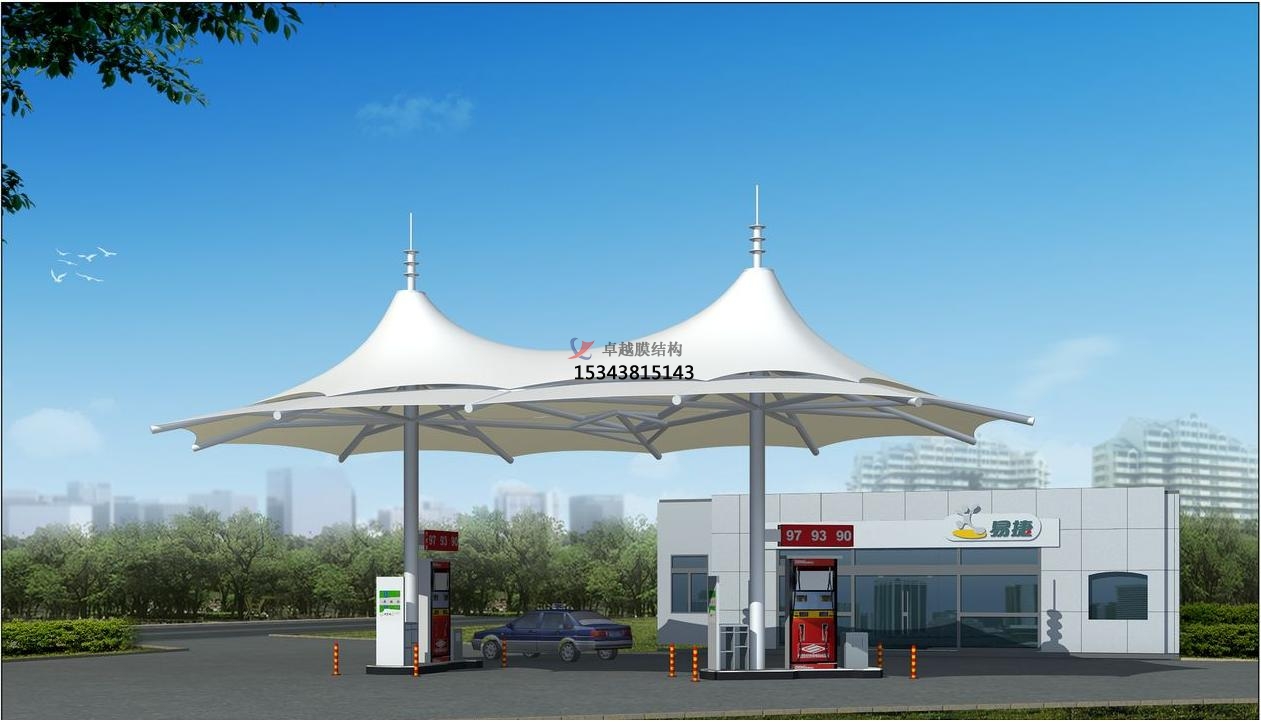 張拉膜雨棚/加氣站頂蓋主要采用鋼結(jié)構(gòu)做骨架支撐結(jié)構(gòu),高自潔建筑膜材做屋面材料防水材料,設(shè)計(jì)美觀大方,結(jié)構(gòu)安全穩(wěn)定,使用壽命可達(dá)15年到30年。廣泛應(yīng)用在于各類大小加油站和加氣站。卓越張拉膜雨棚工程是較早年開展張拉膜設(shè)計(jì)施工的專業(yè)廠家,擁有各類張拉膜設(shè)計(jì)施工總承包資質(zhì),現(xiàn)在為大家介紹一下我司在開封周邊地區(qū)完工的一批張拉膜雨棚工程案例,我司先后在開封附近地區(qū)完工了開封和源燃?xì)庥邢薰竟黄嚰託庹緩埨び昱镯斏w、鄭新奧天然氣開封邊村加氣站張拉膜雨棚遮陽篷、中國石化(中國朱仙鎮(zhèn)木板年畫博物館東南)張拉膜雨棚罩棚等一批完工項(xiàng)目,給大家簡介一下: