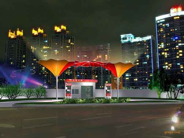 一、造型獨特,辨識度高,由于膜材重量輕,適合加油站這種大跨度的建筑,而且是采用張力結(jié)構(gòu)所以在造型設計上具有很大的優(yōu)勢,可以實現(xiàn)非常具有藝術(shù)氣息的造型。