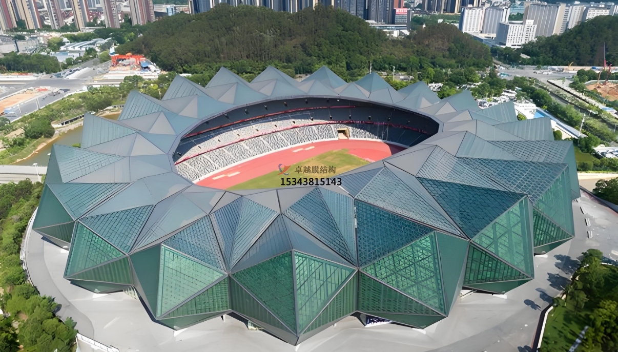 深圳大運(yùn)會體育中心一場兩館采用空間折板結(jié)構(gòu),外觀類似“鉆石”。外層采用陽光板及玻璃幕墻,內(nèi)層采用透光率高、吸音率強(qiáng)、自潔性能好的網(wǎng)格內(nèi)膜材料。深圳大運(yùn)會體育中心的網(wǎng)格內(nèi)膜面積超過10萬平方米。