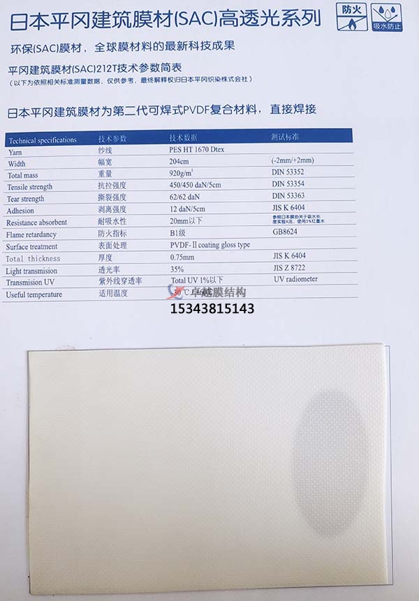 來自日本百年老店的膜材料,世界更早更著名的膜材生產(chǎn)廠家世界更早誕生膜結(jié)構(gòu)的地方,世界好的能生產(chǎn)抗紅外線環(huán)保節(jié)能隔熱膜材的廣家。 全球僅有的兩家級(jí)防火膜材生產(chǎn)廠家之一2世界更大膜結(jié)構(gòu)企業(yè)大陽工業(yè)專用膜材.2010世 博會(huì)世博四及部分場館合作...它在中國的出現(xiàn),必將改變中國的膜結(jié)構(gòu)市場,讓中國的膜結(jié)構(gòu)工程質(zhì)量達(dá)到世界一流水平!