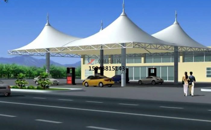 尖頂加油站張拉膜結(jié)構(gòu)效果圖展,常見的加油站張拉膜結(jié)構(gòu)是尖頂?shù)木佣?,白色pvc材質(zhì)的膜也是居多,看上去干凈整潔,而且是阻燃材料,防火,防潮,使用周期久,易于護理和維護,也是成為眾多加油站的不二之選。