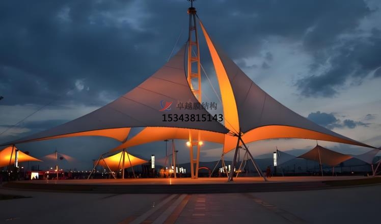 張拉膜景觀的功能及特性:張拉膜景觀不僅提供遮陽避雨的空間,還能創(chuàng)造全天候的建筑環(huán)境,滿足防風(fēng)雨、防日曬等需求。同時,其顯色性在夜間彩燈的映射下形成絢麗繽紛的景觀,提升視覺體驗。張拉膜結(jié)構(gòu)采用環(huán)保聚合物材料,具有輕質(zhì)高強的特點,能有效降低結(jié)構(gòu)自重和能耗,符合綠色建筑的發(fā)展方向。其應(yīng)用范圍廣泛,通常用于體育場館、展覽館、商業(yè)設(shè)施、旅游景區(qū)等場所。例如,在旅游勝地中,它可以搭建棧道、觀景平臺等,連接自然與人類,提供獨特的旅游體驗。在設(shè)計張拉膜景觀時,充分結(jié)合當?shù)氐臍夂?、景觀和文化背景,使其不僅具有功能性,還能成為地域文化的象征,提升旅游地區(qū)的品質(zhì)形象。