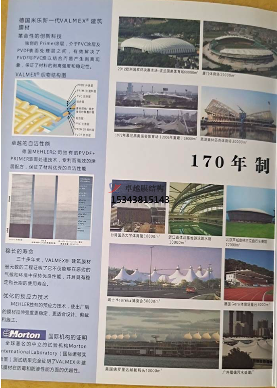 德國MEHLERHAKU米樂公司擁有165年(1837年一2003年)的制造業(yè)經(jīng)驗。通過1S09001質(zhì)量體系認證,所有產(chǎn)品均經(jīng)過嚴格的DIN德國工業(yè)標準,以及各個國家的膜材工業(yè)標準。2002年,德國米樂公司獲聘為中華人民共和國建設部《索膜建筑結構制品》行業(yè)標準編制委員成員。德國米樂的產(chǎn)品系列涵蓋環(huán)保等各種PVC膜材領域,包括:建筑工程、輕型結構、廣告、遮陽、汽艇、軍用、裝飾、水利環(huán)保,等等。