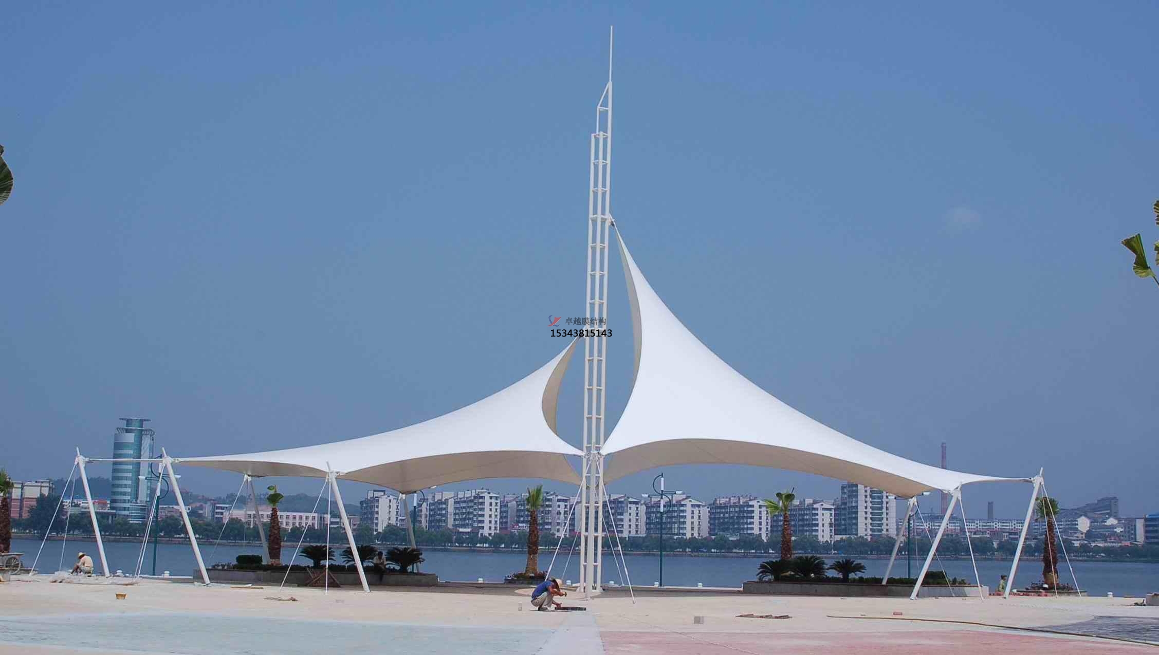 膜結(jié)構(gòu)景觀是一種全新的建筑結(jié)構(gòu)形式,它集建筑學(xué)、結(jié)構(gòu)力學(xué)、精細(xì)化工與材料科學(xué)、計(jì)算機(jī)技術(shù)等為一體,具有很高技術(shù)含量。其曲面可以隨著建筑師的設(shè)計(jì)需要任意變化,結(jié)合整體環(huán)境,建造出標(biāo)志性的形象工程。