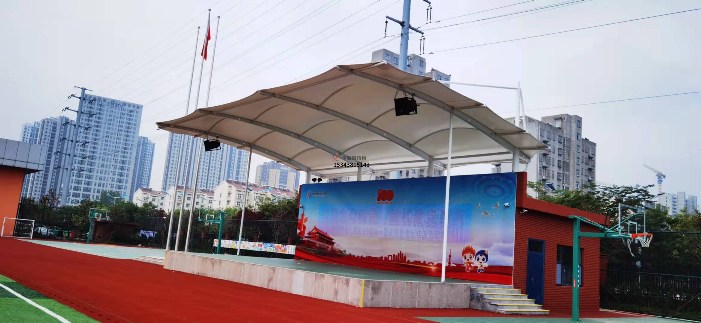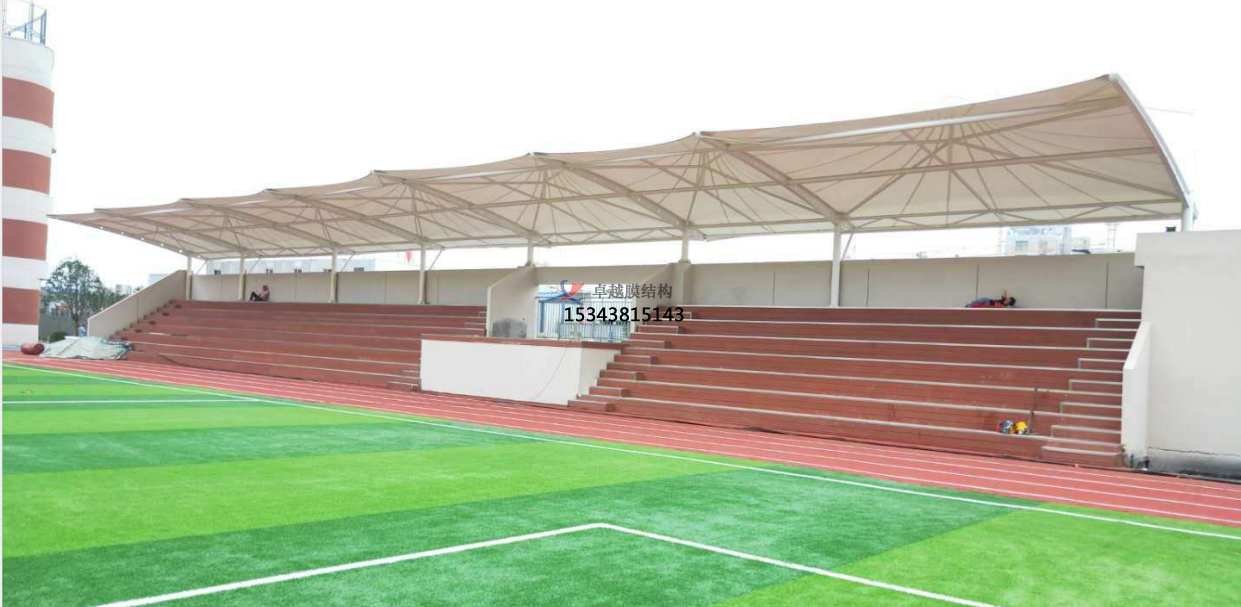 膜結(jié)構(gòu)看臺(tái)在體育設(shè)施上主要應(yīng)用在學(xué)校操場(chǎng)運(yùn)動(dòng)看臺(tái)或主席臺(tái)屋頂,另外大型體育場(chǎng)館看臺(tái)膜結(jié)構(gòu)屋頂也屢見(jiàn)不鮮。看臺(tái)造型般由貝殼形峰膜及部張拉膜組成,形式新穎活潑。膜結(jié)構(gòu)看臺(tái)將鋼架、索、膜巧妙結(jié)合,通過(guò)薄膜、膜邊索、脊索、谷索、拉索、拉桿及定的格構(gòu)梁來(lái)穩(wěn)定。膜頂平滑過(guò)渡,結(jié)構(gòu)美觀、輕巧、整體造型相互輝映,別具格。