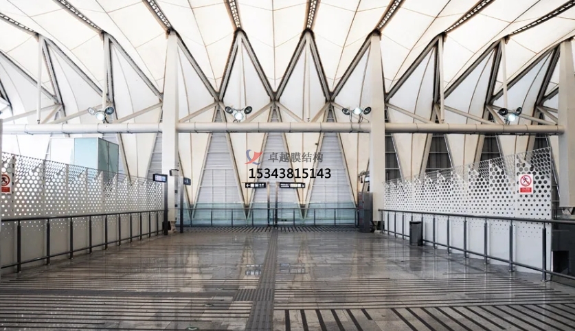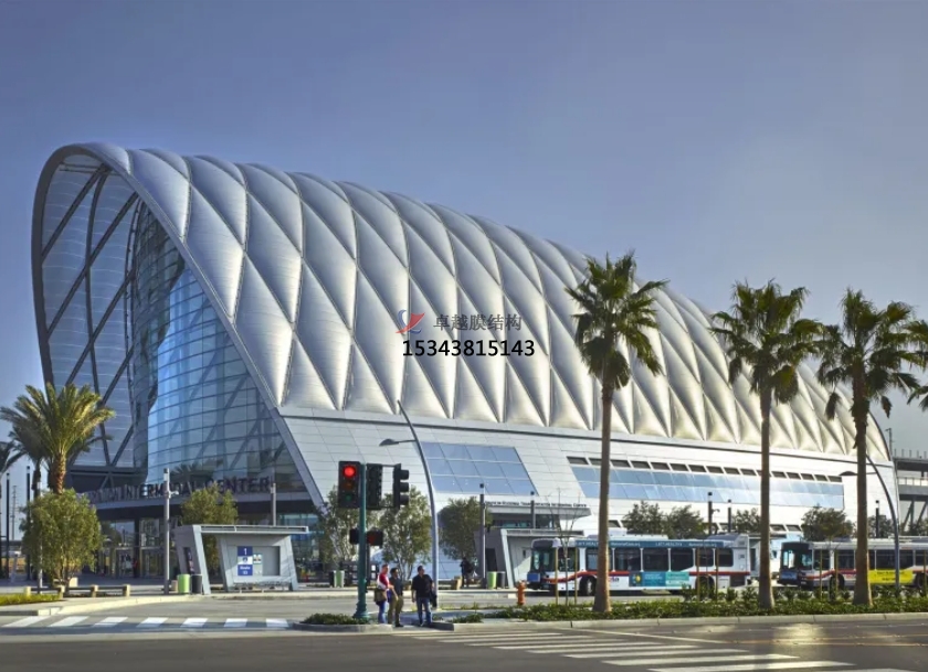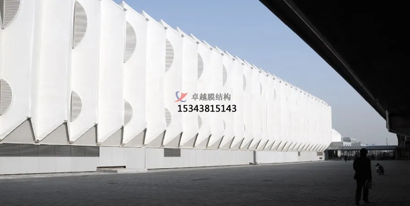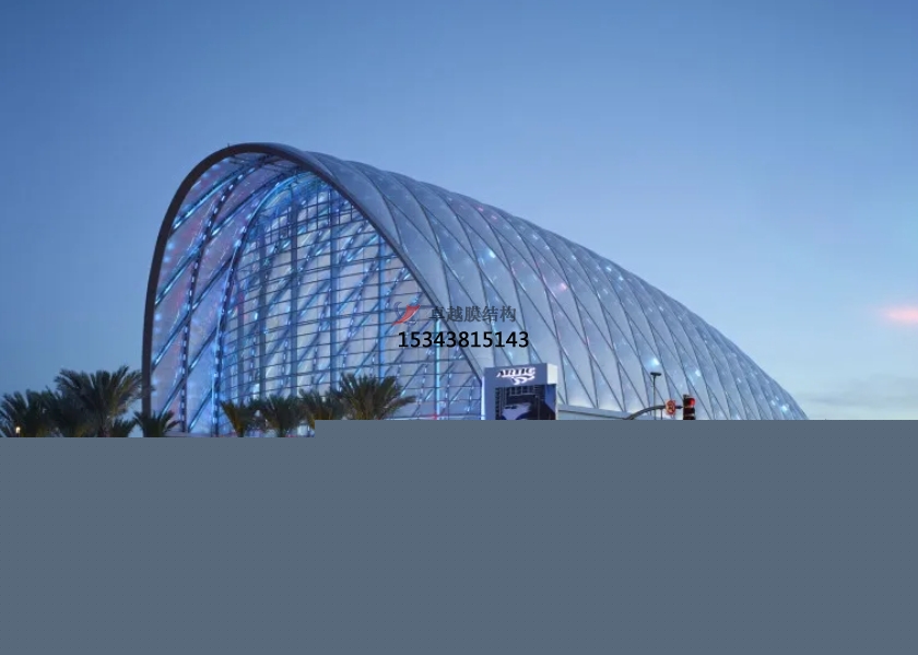 膜結(jié)構(gòu)使得建筑輕盈感十足,膜材料的良好透性使得建筑界面透光而不透視。由于該材料(ETFE)氣枕在陽光底下富有通透感光線可以通過漫射和折射進(jìn)入界面,讓膜結(jié)構(gòu)建筑呈現(xiàn)出朦朧夢幻之美。