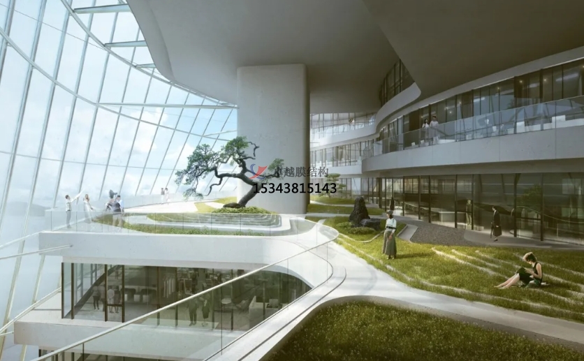 該建筑的采用 PTFE 膜材使得設(shè)計(jì)中心是一座適合當(dāng)?shù)貧夂虻母咝芫G色建筑。特制的半透明遮陽膜,設(shè)計(jì)透光率為40%,既降低了建筑的太陽輻射,又給辦公空間提供了充分柔和的自然光。