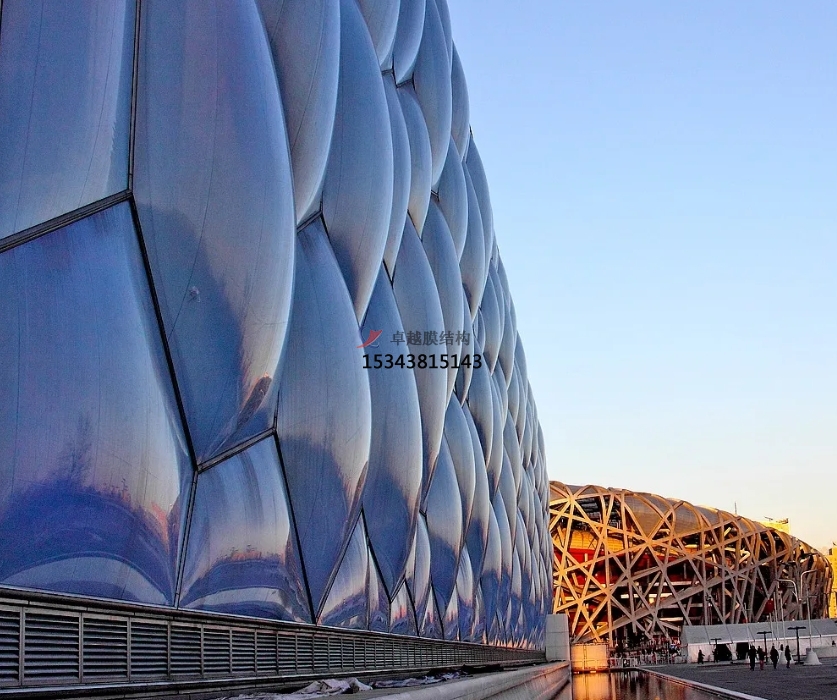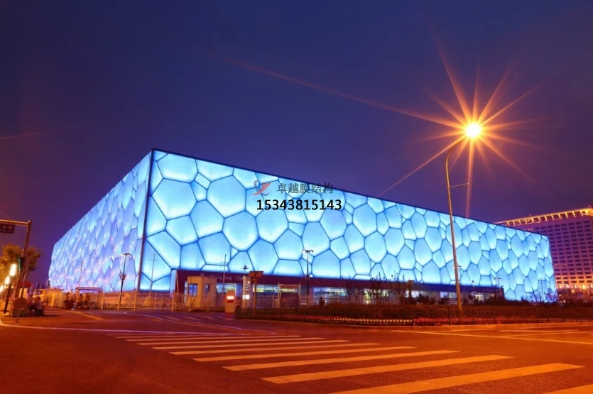 基于“泡沫”的設(shè)計(jì)靈感,設(shè)計(jì)師為“方盒子”包裹上了一層建筑外皮,上面布滿了酷似水分子結(jié)構(gòu)的幾何形狀;通過覆蓋的ETFE 透明膜賦予了建筑冰晶狀的外貌,使其具有獨(dú)特的視覺效果和感受,輪廓和外觀因此變得柔和,水的神韻在建筑中得到了完美的體現(xiàn)。