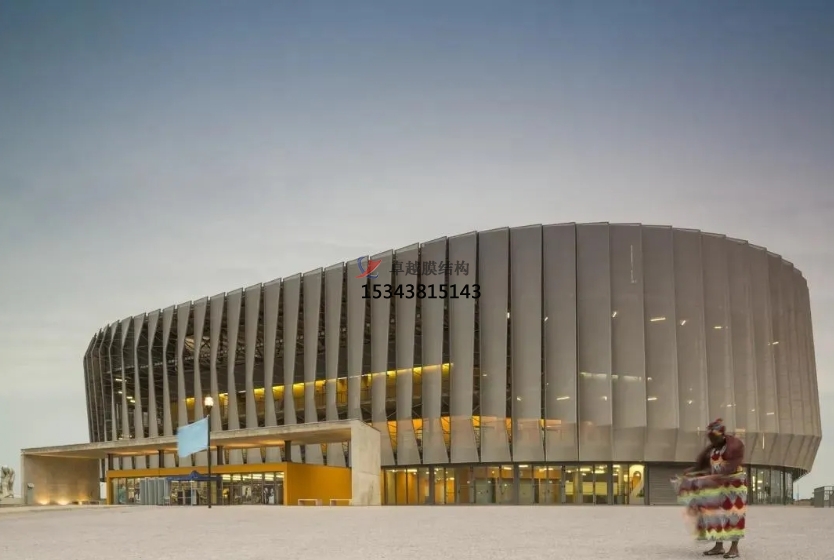 羅安達(dá)綜合體育館位于安哥拉首都羅安達(dá),該場地承辦了2013年場地冰球世界杯,這也是場地冰球世界杯第一次在非洲舉辦。項(xiàng)目面積30000㎡??梢匀菁{12000名觀眾,該體育館采用膜結(jié)構(gòu)幕墻作為外立面。為了適應(yīng)羅安達(dá)(安哥拉首都)的氣候特征,體育館上部分以平坦的裝飾圍欄配合膜結(jié)構(gòu)作為建筑表皮。