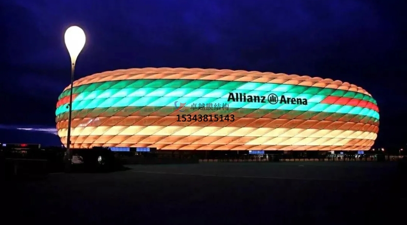 安聯(lián)球場的外墻由許多個(gè)ETFE氣枕構(gòu)成,內(nèi)嵌發(fā)光系統(tǒng),超過三十萬個(gè)LED燈可在夜晚組成1600 萬種顏色圖形。它是世界上最早能實(shí)現(xiàn)變色的球場。由于每個(gè)表皮構(gòu)建有34度的斜角,即使身處最高層看臺也能提供同樣棒的視覺效果。