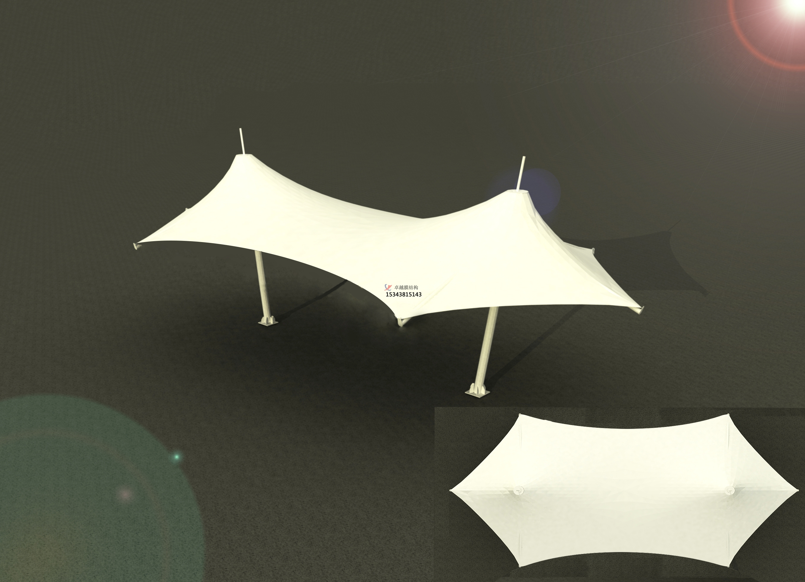 2、景觀膜結構是目前發(fā)展很快的一種新型空間結構,是一種效率極高的張力集成體系,可以充分發(fā)揮鋼索的強度與張拉整體結構的空間作用。它通過鋼骨架、鋼索與膜材共同受力形式穩(wěn)定曲面來覆蓋建筑空間,具有高度的形體可塑性和結構靈活性,即通過對膜材內(nèi)部施加一定的預張力,使其具備了抵抗外荷載能力,從而充當結構材料的一種結構體系。我公司先后在池州地區(qū)承接了池州百荷公園景觀、皋城中心廣場景觀、池州萬達廣場景觀小品的設計施工,簡介如下: