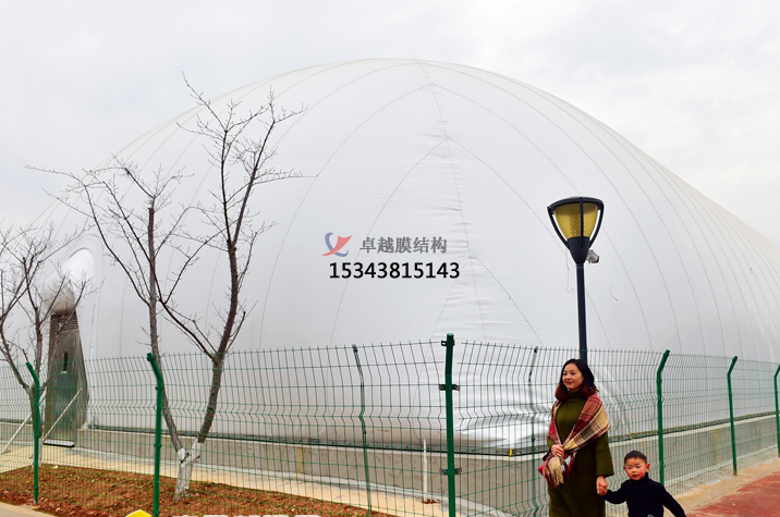 2、我公司利用膜結構的輕巧,別致的造型建造各種半封閉,全封閉充氣膜結構中的高強度柔韌薄膜稱膜材,它是一種耐腐蝕、耐高溫、耐久用、高強度的樹脂類涂層織物,由多種復合PVC樹脂涂層刀刮成型,具有質(zhì)地柔韌、厚度小、重量輕、透光性好的特點。對自然光吸收和透射能力、阻燃,具有良好的耐久、防火、氣密等特性;表面經(jīng)過特氟龍?zhí)幚砘蚨?a title="氧化">氧化鈦抗老化處理,具有較高的自清潔性能。下面就大家介紹一下我公司在蘭州市地區(qū)完成的部分膜結構項目。