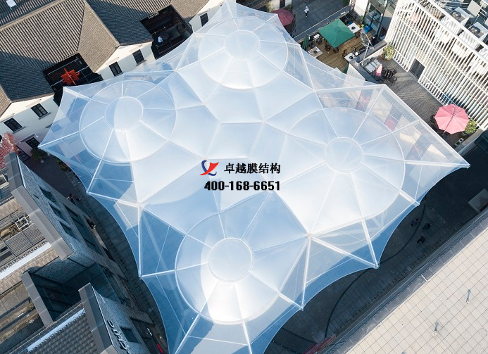 工程特點:該項目是國內(nèi)好的單層ETFE加雙層氣枕膜完美嵌合的景觀雨棚建筑,利用ETFE膜材的高透光高自潔性以及雙層氣枕的隔熱能力,雨棚在具有遮陽擋雨功能的同時還可以實現(xiàn)自然采光,行人沒有傳統(tǒng)密封建筑的束縛感;另一方面,ETFE膜結(jié)構(gòu)建筑是當(dāng)代更新的建筑應(yīng)用形式之一,工程高度定制,顏值高,具有好的性,天生自帶聚集人氣光環(huán)。