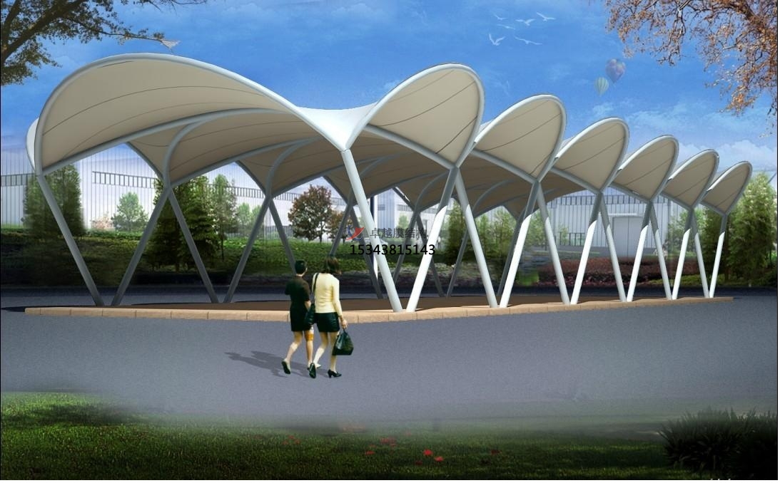 膜結(jié)構(gòu)雨棚按其結(jié)構(gòu)形式可分為鋼結(jié)構(gòu)、張拉結(jié)構(gòu)及充氣結(jié)構(gòu);按膜材特性又可分為永久性膜結(jié)構(gòu)(膜材使用年限可超過25年)、半永久性膜結(jié)構(gòu)(膜材使用年限為10-15年)及臨時(shí)性膜結(jié)構(gòu)(膜材使用年限為3-5年);按膜材成分又可分為PVDF膜材、PTFE膜材及ETFE膜材。