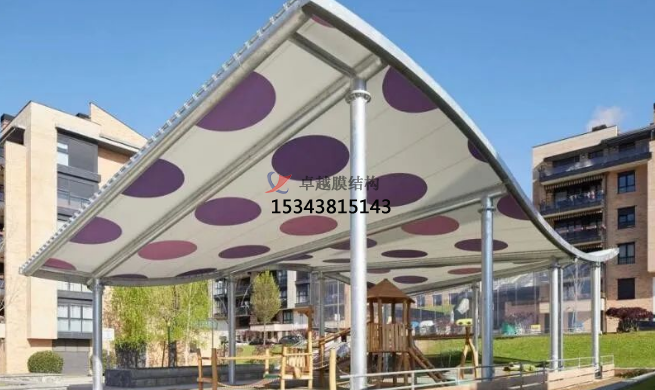 兒童游樂場所本就是趣致可愛的,迎合孩子們的喜好,配套遮陽設(shè)施的建設(shè)也應(yīng)該考慮在內(nèi),下面兩個(gè)遮陽項(xiàng)目屬于同一系列,波點(diǎn)圖案,活潑的色調(diào),再加上起伏的造型,讓人感覺輕松愉快。兩個(gè)項(xiàng)目都采用PVC+ETFE膜材。