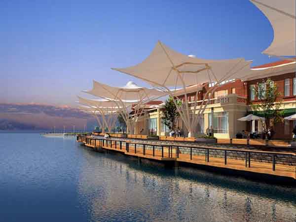 PTFE 膜材是采用獨有的技術(shù)方法將玻璃纖維紗進行四氟化乙烯樹脂涂層的一種復(fù)合材料;其玻璃纖維絲具有超強的拉伸強度,它的強度遠高于鋼材,具有非常強的抗蠕變性能。該膜材的彈性模量遠低于其它膜材,這有利于膜材形成復(fù)雜的曲面造型;PTFE 建筑膜材的涂層表面由于自由能極低,使該產(chǎn)品具有高度的自潔性能;依靠自然的雨水沖刷,材料表面就能保持干凈和潔白,該表面完全惰性化 : 惡劣的環(huán)境,如霉菌,酸雨等將不對 PTFE 膜表面起作用;PTFE 材料中不含容易移出的增塑劑,抗氧化劑,紫外線吸收劑等;并且防潮,防霉,耐污性能良好,不沾性能卓越;能夠在 -80℃到 +250℃的溫度范圍內(nèi)安全使用,具有良好的耐熱性,耐濕性,耐化學(xué)性等特性,即使在承受了暴風雪這類惡劣天氣后,膜結(jié)構(gòu)仍然能維持初始狀態(tài),膜材不會產(chǎn)生松弛。