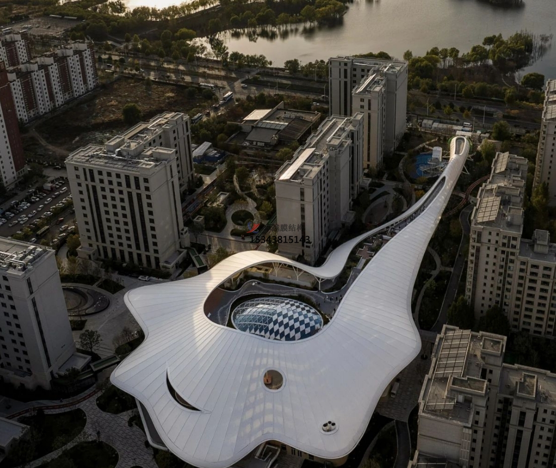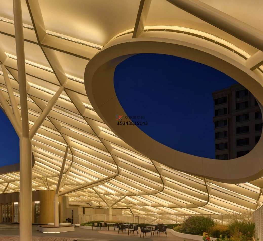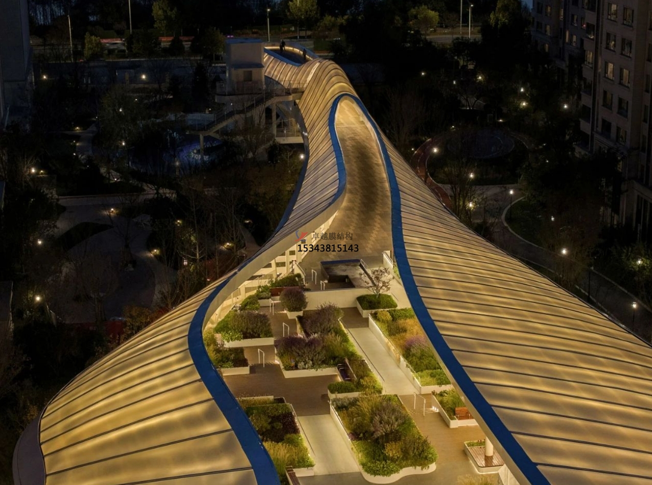 該半透明法拉利進(jìn)口PTFE膜材,遮陽防水,自然采光,既可以保證日間二層屋頂花園能夠有充分光照,夜間也可利用膜的反射來提供屋頂花園的照明功能需求。