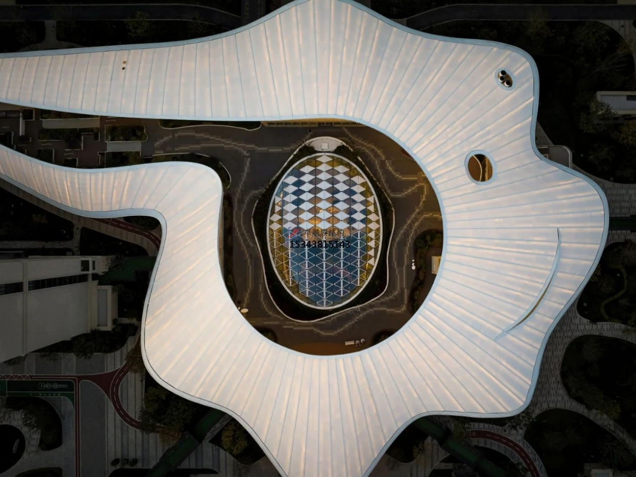 相對于四周規(guī)則的建筑形態(tài),活力中心呈現(xiàn)更加自由和充滿活力的有機(jī)形態(tài):如一顆水珠滴落,在場地中激起漣漪,自中心散開、升騰,形成一片白色、柔軟的云朵,最終轉(zhuǎn)化為自由的大屋頂。