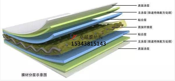PVDF膜材加工是在聚酯纖維基布上涂上Pv(聚氬乙烯)樹酯后加上100%PVDF(聚偏氟乙烯)表面涂層而成的復合材料。PVDF膜權由于自潔性良好、價格適中、運輸安裝方使,更廠泛應用于各類建筑領域。它的壽命因不同的表面涂層而異,一股可達成10-25年,其構造形式見下圖: