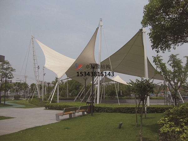 張拉膜以性能優(yōu)良柔軟織物為材料,由膜內空氣壓力支撐膜面,或利用柔性鋼索或剛性支撐結構使膜面產生一定的預張力,從而形成具有一定剛度、能夠覆蓋大空間的結構體系。張拉膜結構造型自由、輕巧、柔美,充滿力量感,又因其材質的可塑造性強,因此建筑師結合張拉膜的這種特性,充分發(fā)揮建筑師的想象力,用不同的裁剪和不同的節(jié)點位置形狀而產生出的不同的藝術表現(xiàn)形式,可謂是一種新型藝術的表現(xiàn)形式。