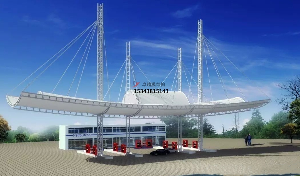 負(fù)高斯曲面是一種最基本穩(wěn)定的空間膜曲面,復(fù)雜的膜建筑是由各種符合膜受力特點(diǎn)的各種基本造型組合實(shí)現(xiàn)。用作加油站的膜結(jié)構(gòu)適合采用的形式有多點(diǎn)對稱拋物面、組合拋物面、馬鞍形拋物面錐形雙曲拋物面、拱支承型等等。膜結(jié)構(gòu)的鋼構(gòu)件、膜面及其它零配件都是工廠預(yù)制件,安裝方便,施工時(shí)間很短。非常適合工期緊,需要短時(shí)間投入運(yùn)營的加油站工程。