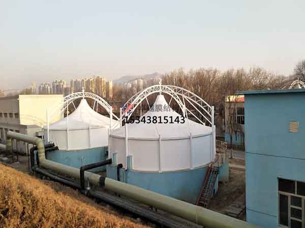 2、卓越膜結構工程公司是集污水池加蓋反吊膜加蓋工程設計施工、結構設計、靜動力計算分析、整體結構安裝以及使用維護于一體的綜合性工程公司。污水池反吊膜結構中的高強度柔韌薄膜稱膜材,它是一種耐腐蝕、耐高溫、耐久用、高強度的樹脂類涂層織物,由多種復合PVC樹脂涂層刀刮成型,具有質地柔韌、厚度小、重量輕、透光性好的特點。對自然光吸收和透射能力、阻燃,具有良好的耐久、防火、氣密等特性;表面經(jīng)過特氟龍?zhí)幚砘蚨趸伩估匣幚?,具有較高的自清潔性能。下面就大家介紹一下我公司在棗莊市地區(qū)完成的部分污水池膜結構封閉項目。