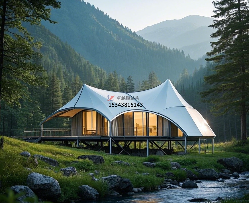 帳篷酒店膜結(jié)構(gòu)以其豐富多變的造型脫穎而出。設(shè)計(jì)靈感常來源于自然界,如白蟻巢穴、蜂巢、螢火蟲和蝸牛等生物形態(tài)。建筑師通過巧妙構(gòu)思,將這些元素融入設(shè)計(jì),打造出方形帳篷、螺旋帳篷等獨(dú)特空間結(jié)構(gòu)。帳篷的輕盈、通透特質(zhì),與周圍自然環(huán)境完美呼應(yīng),形成一道獨(dú)特風(fēng)景線。像可見澤棲帳篷酒店,其客房 “水映螢火” 采用玻璃箱外蓋膜結(jié)構(gòu),既保證貼水居住的舒適感,又解決遮陽難題;“螺中洞天” 客房則運(yùn)用雙層膜與保溫棉結(jié)構(gòu),滿足螺旋造型需求的同時(shí),提升內(nèi)部舒適度,從不同角度展現(xiàn)出膜結(jié)構(gòu)在美學(xué)設(shè)計(jì)上的無限可能。