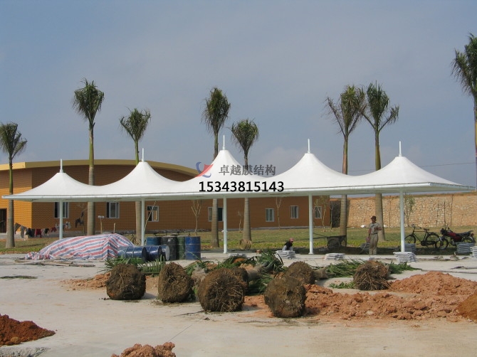 某看臺(tái)工程采用張拉膜景觀,形式新穎、活潑。鋼架與索和膜合理結(jié)合,膜頂平滑過渡,結(jié)構(gòu)美觀、輕巧、整體造型相互輝映,自具一格。以下介紹的是該張拉膜景觀工程的設(shè)計(jì)步驟及準(zhǔn)則,為以后工程的設(shè)計(jì)提供了參考。