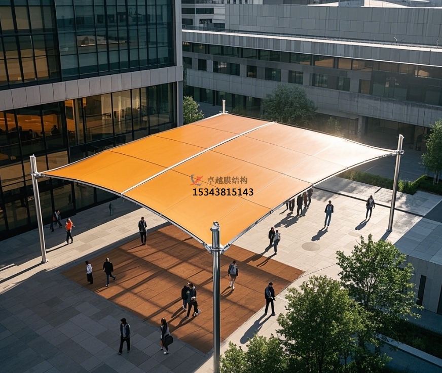 露天步行商業(yè)街的公共座椅旁,膜結(jié)構(gòu)遮陽傘是常見的配置。它與傳統(tǒng)可移動遮陽傘不同,采用先預埋基礎(chǔ),再搭建鋼構(gòu),最后張拉膜材的方式固定。其造型豐富多樣,顏色可根據(jù)整體環(huán)境定制,不僅具備出色的抗紫外線、抗老化性能,使用壽命長,而且自潔性好,為商業(yè)街增添了一抹亮麗色彩,成為實用與美觀兼具的景觀設(shè)施。